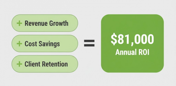 The ROI comes from three areas: 1) Increased Revenue, by winning more competitive deals with a flexible, modern offering. 2) Cost Savings, by reducing or eliminating fixed license fees and saving thousands of hours of manual administrative work. 3) Client Retention, by mitigating the risk of clients leaving due to outdated technology. Our sample model shows a potential annual ROI of over $81,000.