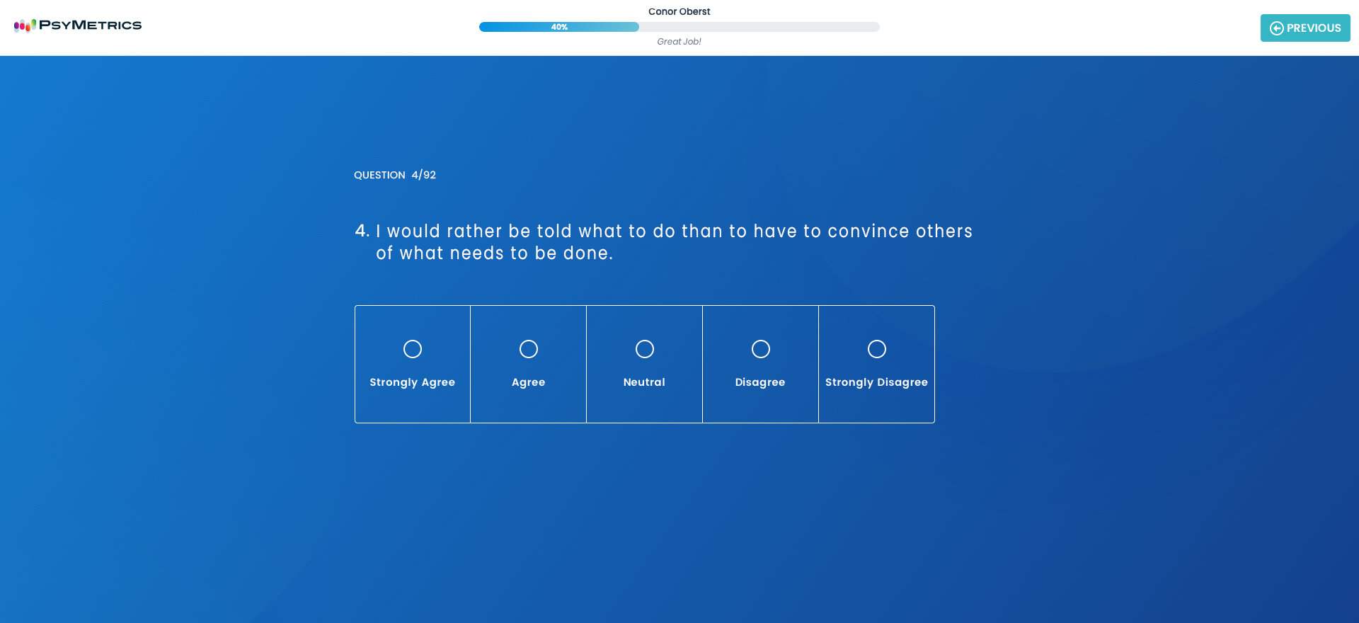 The degree to which the individual is likely to be self assured, is not overly affected by what others think of them, and is confident in their decisions and actions. This characteristic is important for jobs that require independent thought, a self-starter attitude, sales and management.