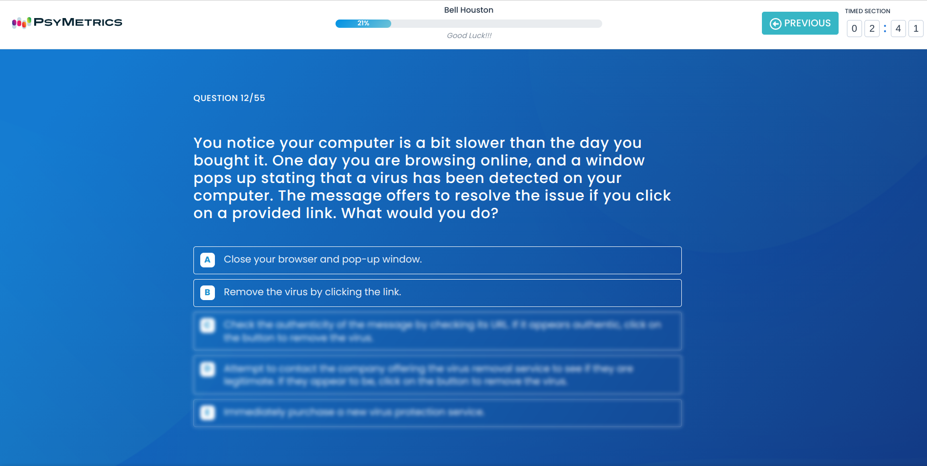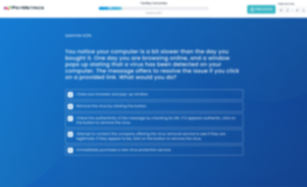 The Office Skills-Computer Literacy Test assesses an individual's computer literacy skills. It focuses on a wide range of computer concepts ranging from computer security and an understanding of search engine and browser functions to a general knowledge of operating systems, networking and the most popular Microsoft Office applications. Scores for Basic, Intermediate and Advanced levels are provided.