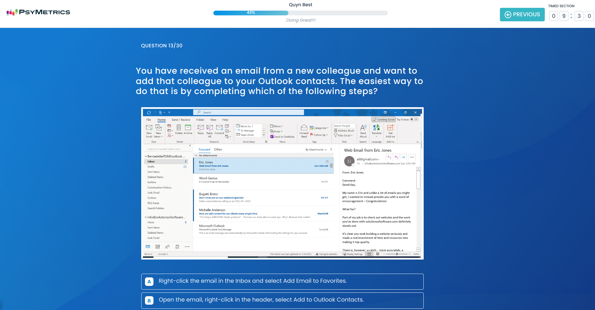 The Office Skills-Outlook Skills Test assesses an individual's skill level by requiring them to perform critical Outlook functions (i.e., Calendar, Contacts, Folders, Mail, Tasks and Tools). Scores for Basic, Intermediate and Advanced levels are provided.