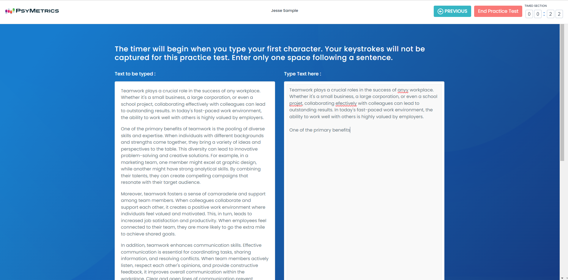The Office Skills-Typing Test assesses an individual’s typing speed and error rate. Easy to read score report shows scores for Words Per Minute, Error Rate and presents results relative to average and professional typists.