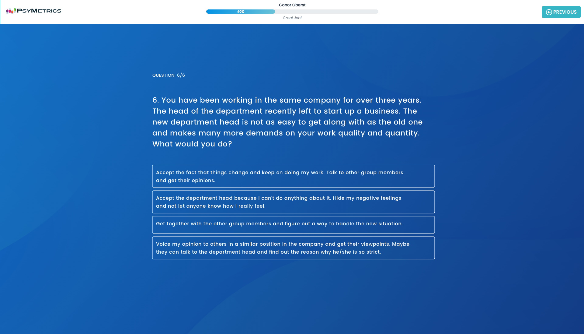 The Situational Judgment Test - Teams consists of attitudinal, behavioral and situational questions aimed at assessing the candidate's ability to problem solve and use appropriate judgment in team environments. The test is designed to help identify those individuals who are more likely to be productive in work environments where teamwork is critical for success.